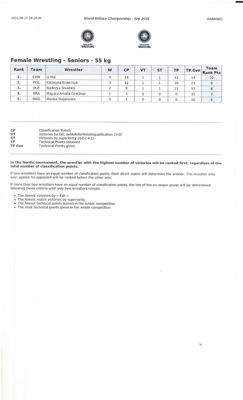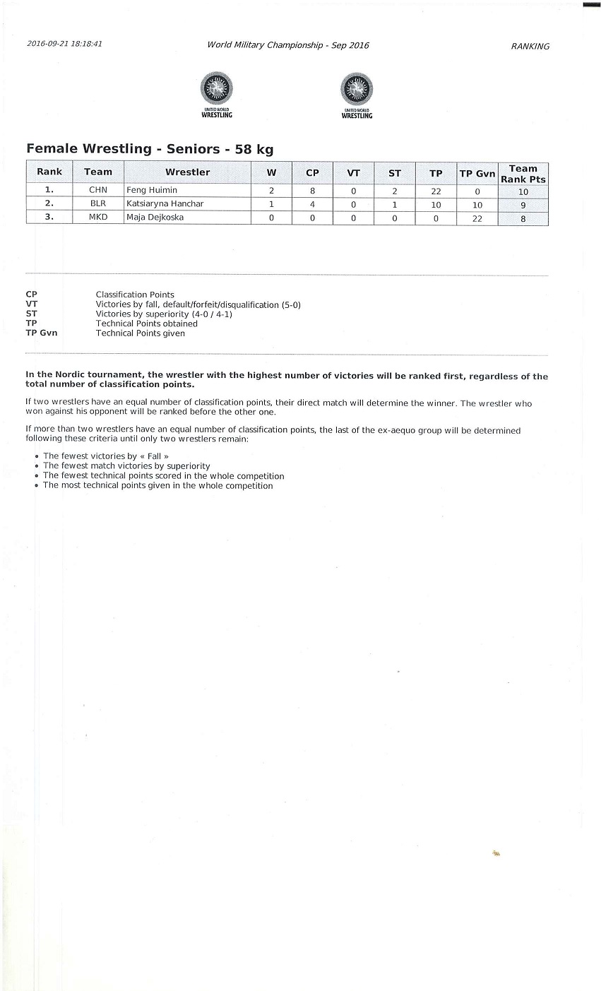 SKOPJE (MKD) – On September 21, the second day of the 31st World Military Wrestling Championship started with the first competitions. The preliminary competitions took place in the morning for the following categories: Men’s Freestyle 57kg, Men’s Freestyle 61kg, Men’s Freestyle 65kg, Men’s Freestyle 70kg, Women’s Freestyle 48kg, Women’s Freestyle 53kg, Women’s Freestyle 55kg and Women’s Freestyle 58kg.