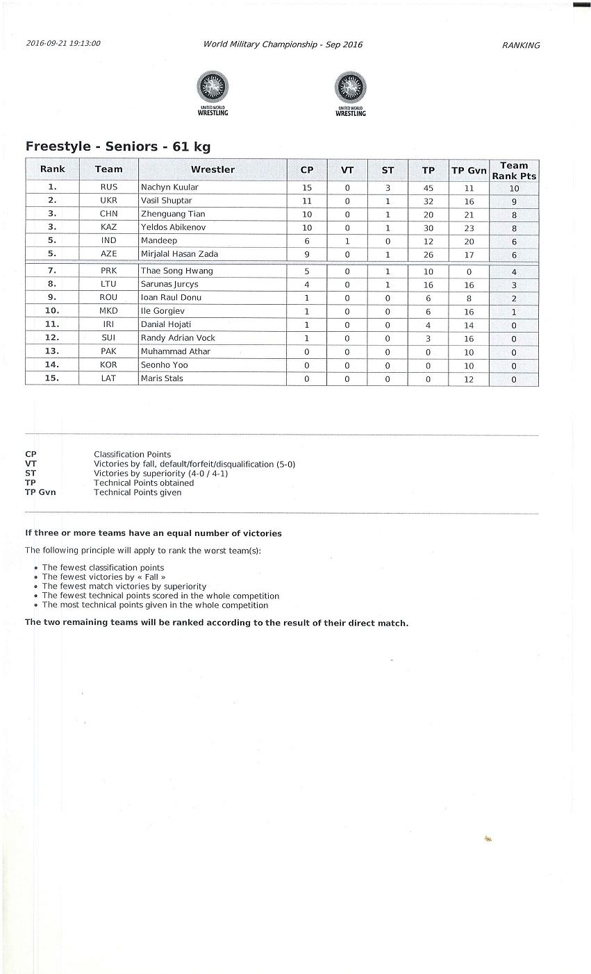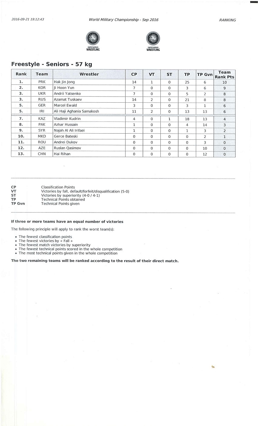 In the 65kg category, the Azeri wrestler Aghahuseyn Mustafayev won the competition ahead of Kuk Gwang Kim (PRK), silver medalist, and Rajneesh (IND) and Gamlet Ramonov (RUS), both bronze medalists. Finally, Russia won its first medal of the WMC with the victory Magomed Kurbanliev in the 70kg category. Joshgun Azimov (AZE) is ranked second. Andrei Karapach (BLR) and Farzad Kolivand (IRI) are both on the third step of the podium.