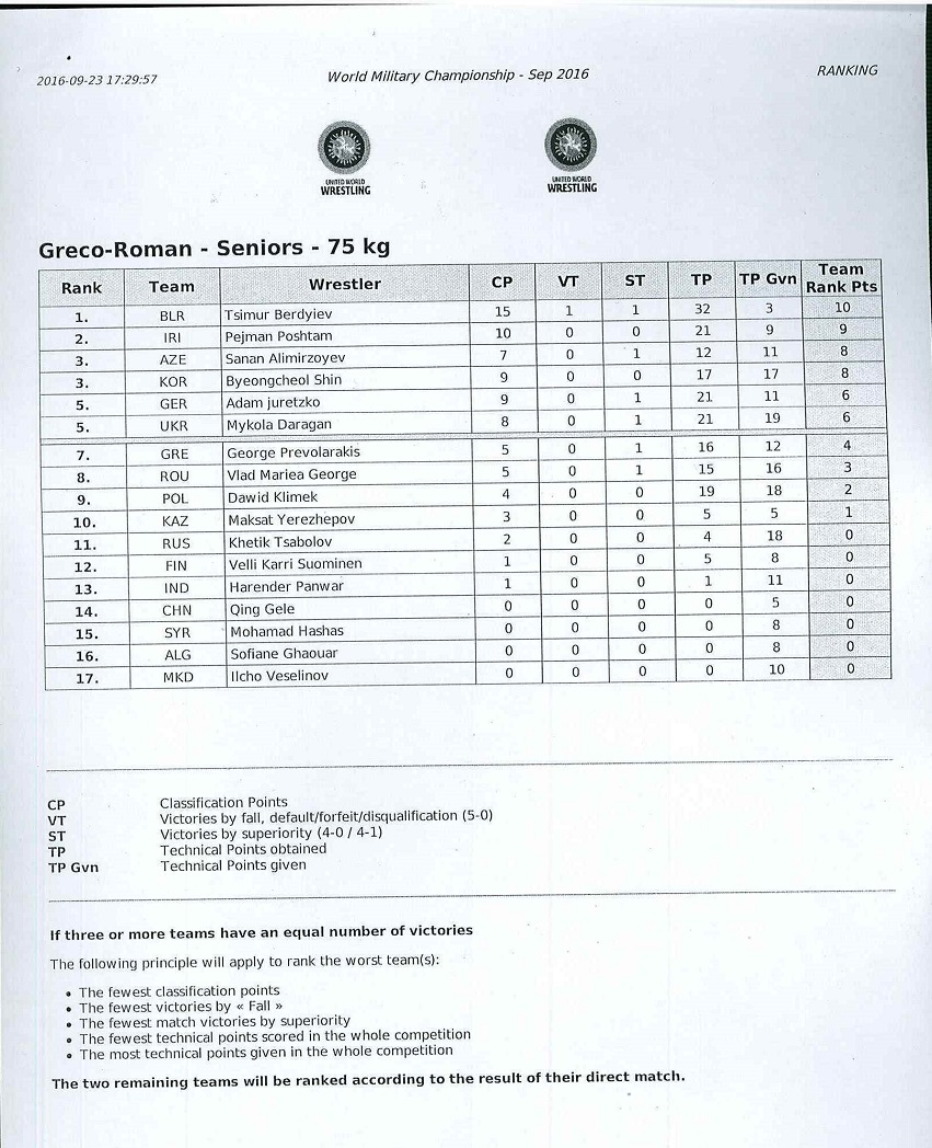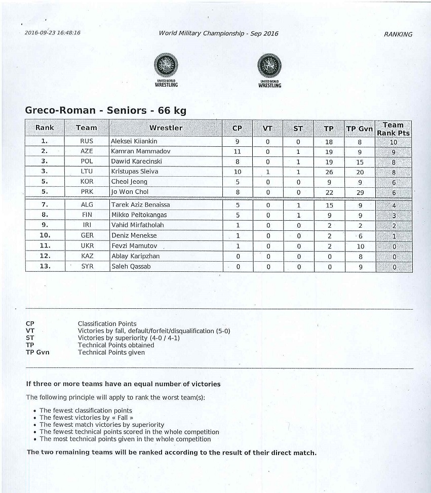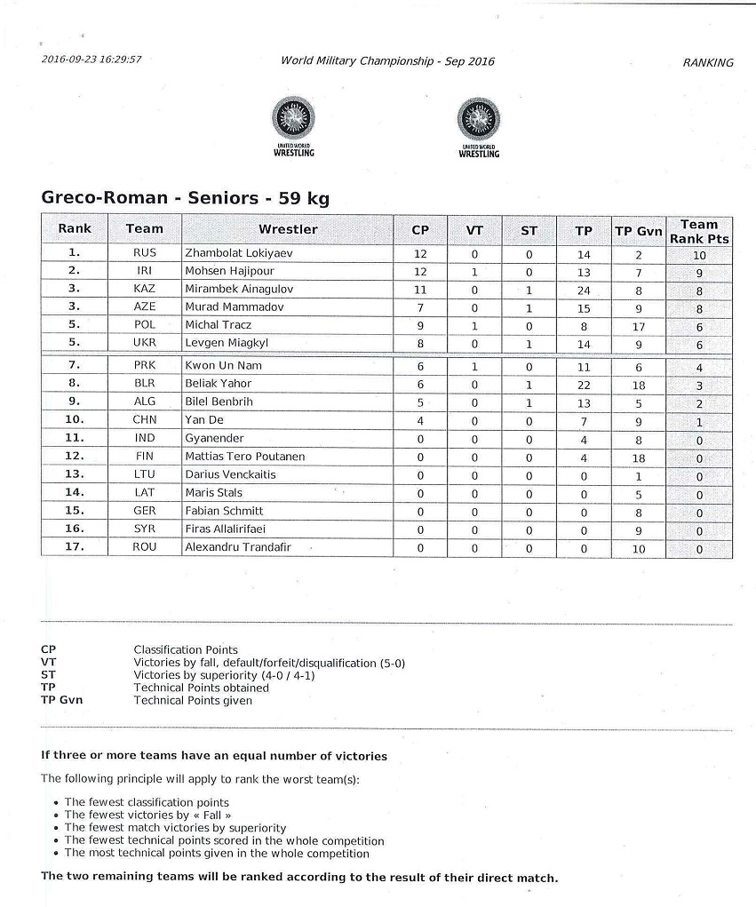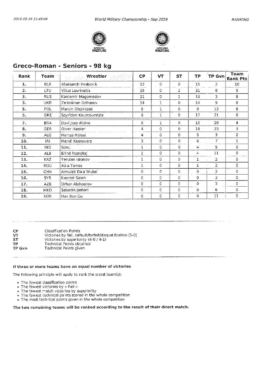 The complete results are available here: men’s Greco-Roman 59kg, men’s Greco-Roman 66kg, men’s Greco-Roman 71kg, men’s Greco-Roman 75kg, men’s Greco-Roman 80kg, men’s Greco-Roman 85kg, men’s Greco-Roman 98kg and men’s Greco-Roman 130kg.