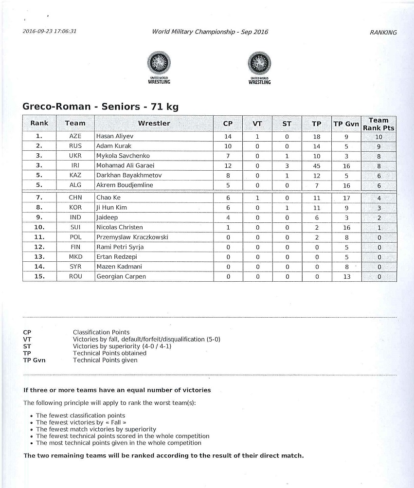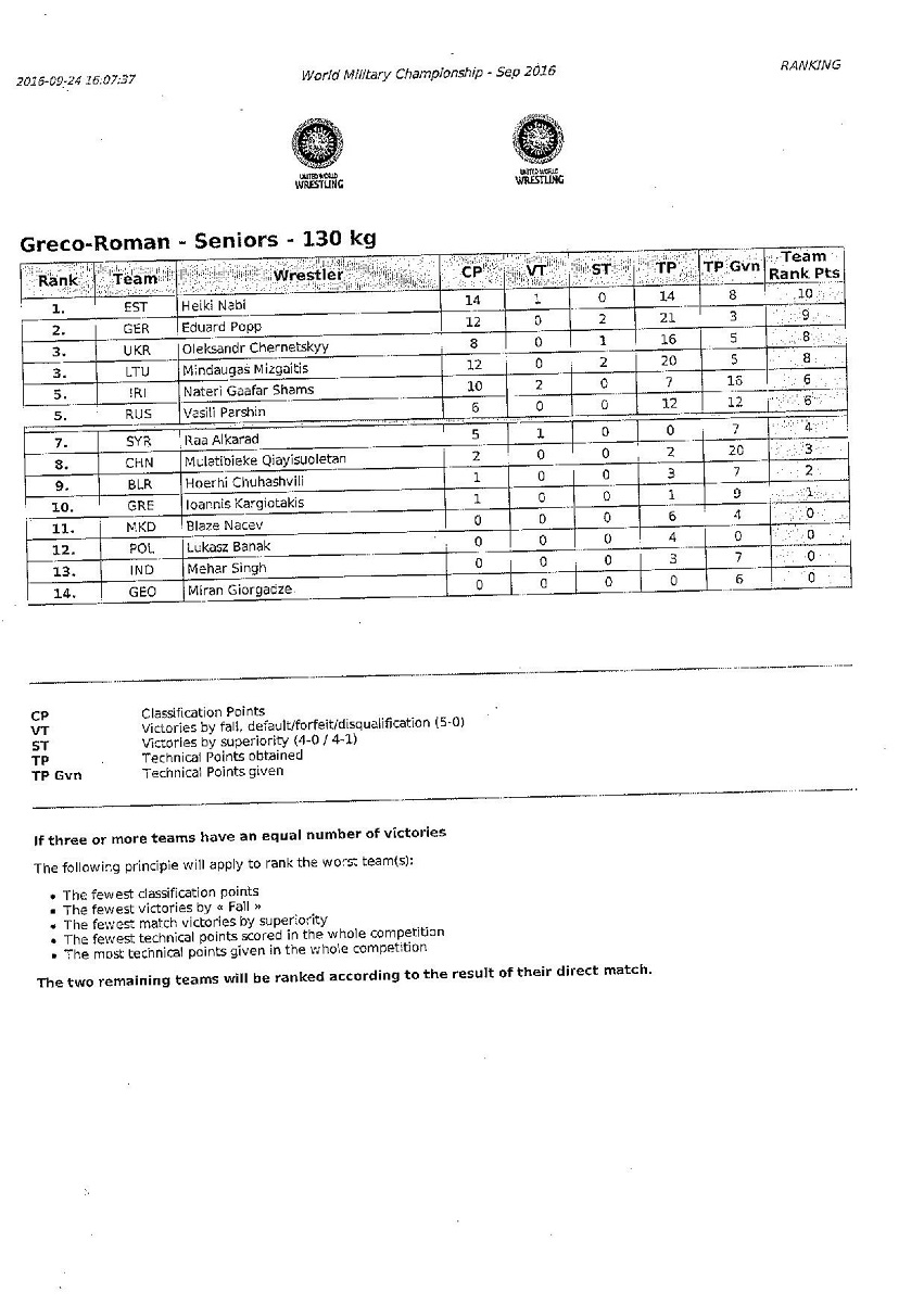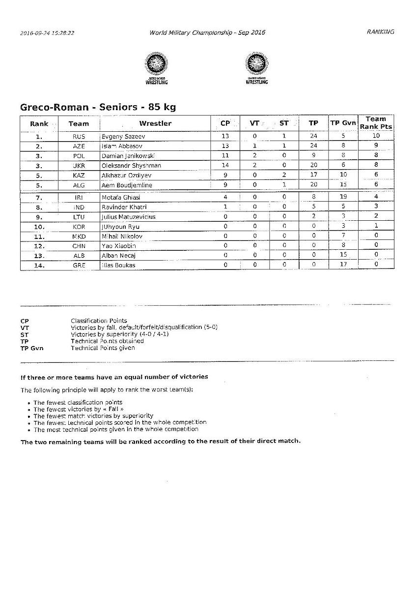 The complete results are available here: men’s Greco-Roman 59kg, men’s Greco-Roman 66kg, men’s Greco-Roman 71kg, men’s Greco-Roman 75kg, men’s Greco-Roman 80kg, men’s Greco-Roman 85kg, men’s Greco-Roman 98kg and men’s Greco-Roman 130kg.