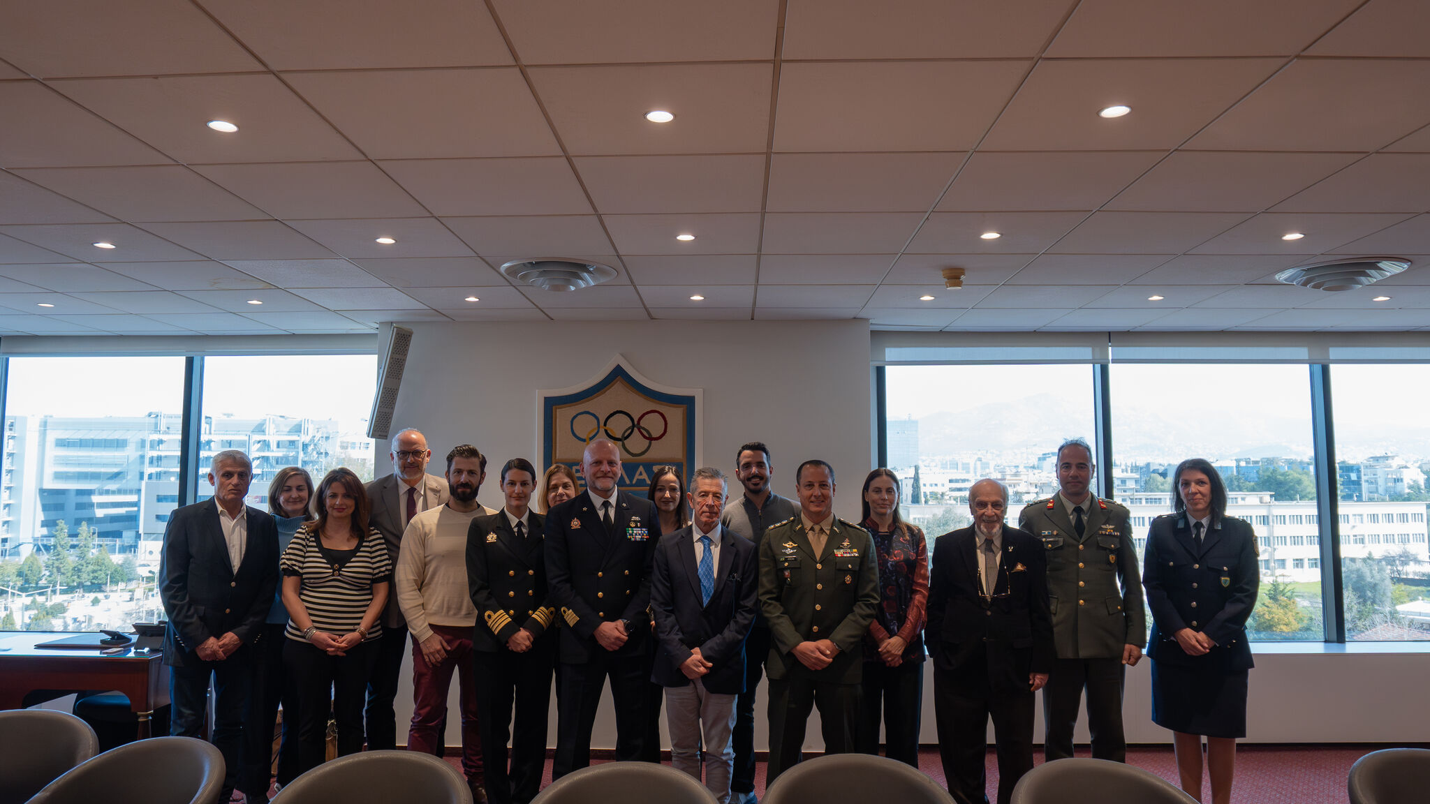 The meeting brought together senior representatives from both institutions. CISM was represented by its President, Colonel Nilton Gomes Rolim Filho, Secretary General Navy Captain Roberto Recchia, and CISM HQ Academic Director Commander Florentia Sfakianou. The Greek Delegation to CISM was represented by Captain (ret.) Spyridon Andriopoulos, Chief of the Greek Delegation to CISM, Lt Colonel Georgios Chasanakos, Director of the Supreme Sports Council of the Hellenic Armed Forces, and Police Warrant Officer Sofia Andriopoulou.