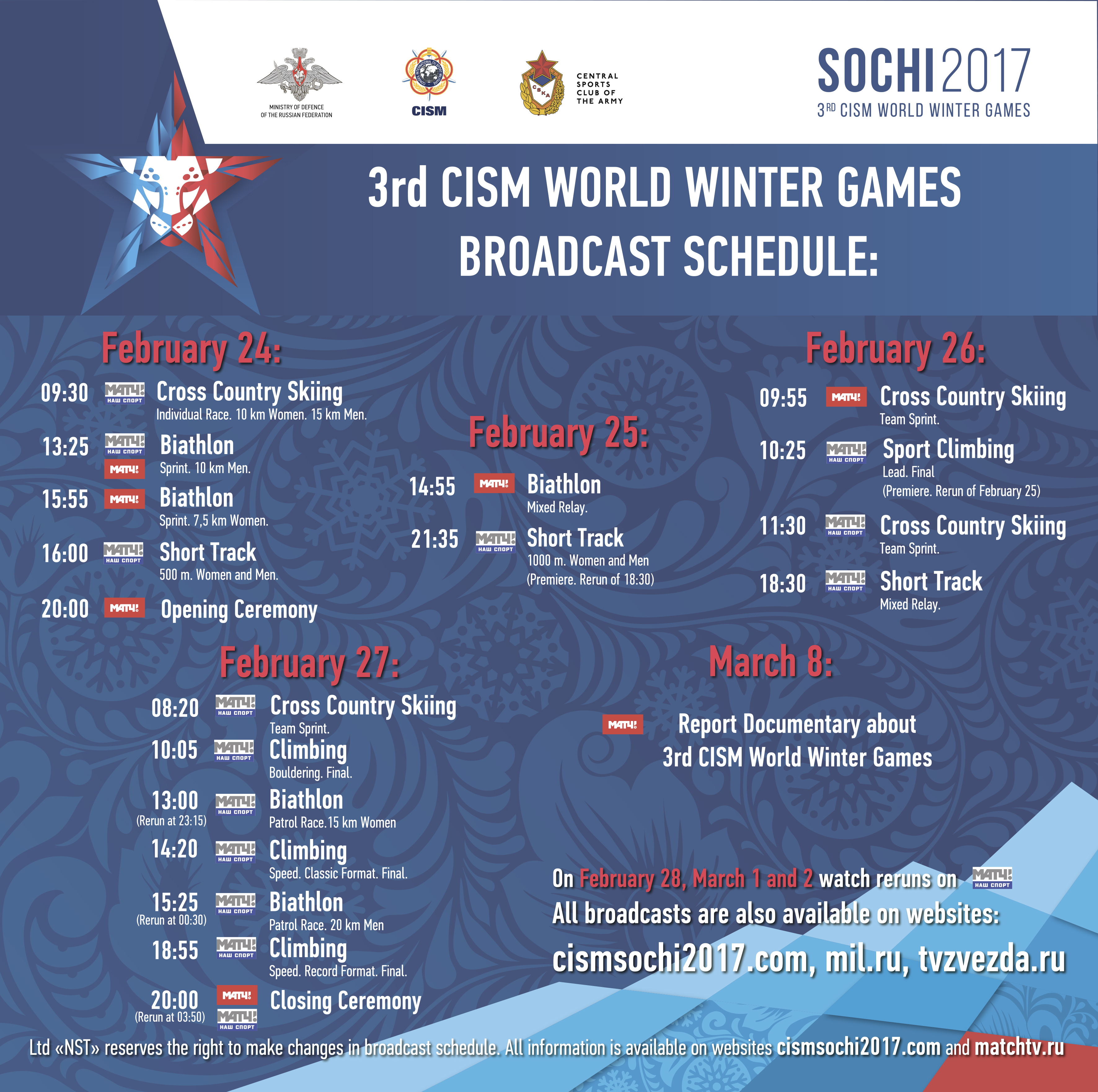 Today (27/02/2016), for the last day of competition of the 3rd World Winter Games Sochi 2017, the following events will be livestreamed on the official CISM Livestreaming Platform www.militaryworldgames.com: